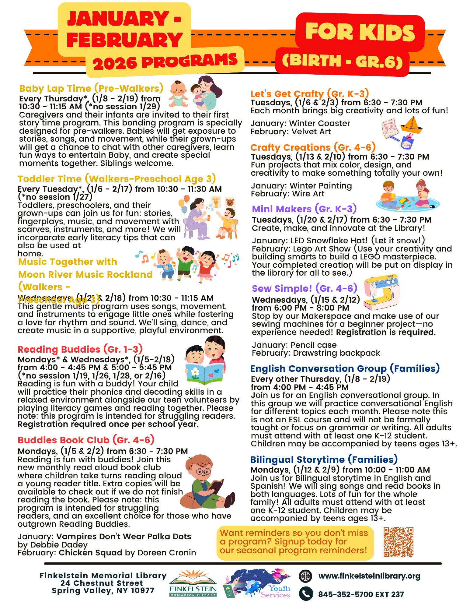 All programs are always free, with all materials provided. Unless otherwise noted, all programs are drop in and require no pre-registration. Want reminders so you don’t miss a program?